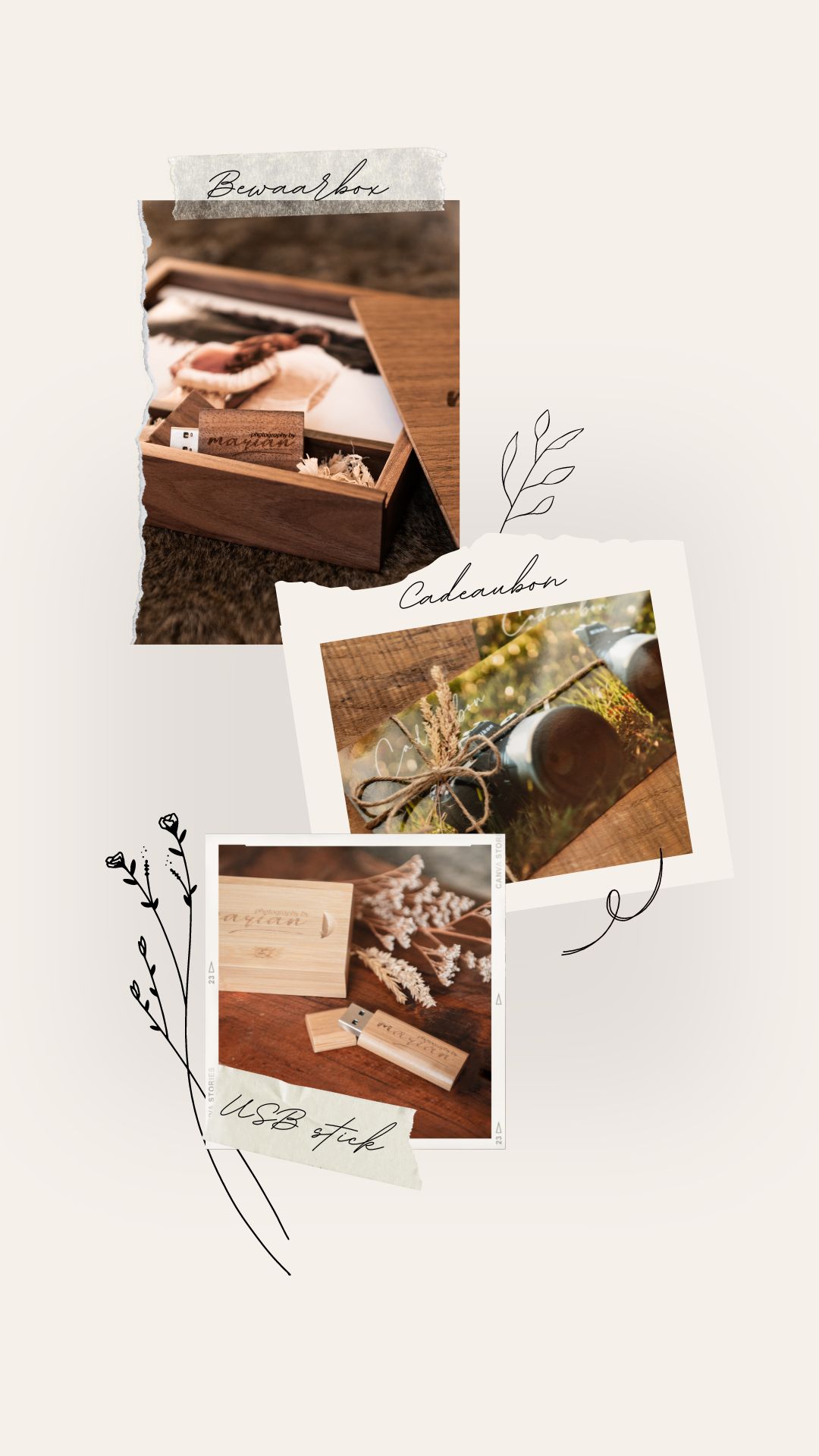 Wanneer ik klaar ben met het uitzoeken en bewerken van de foto’s worden ze in een online album geplaatst. Je kunt de foto’s vanaf deze plek bekijken en downloaden of delen met anderen. Hier blijven ze ongeveer een maand ter beschikking. Ook krijg je alle foto’s aangeleverd op een houten USB stick. Afhankelijk van het pakket wat je uitkiest zitten er nog extra’s bij.